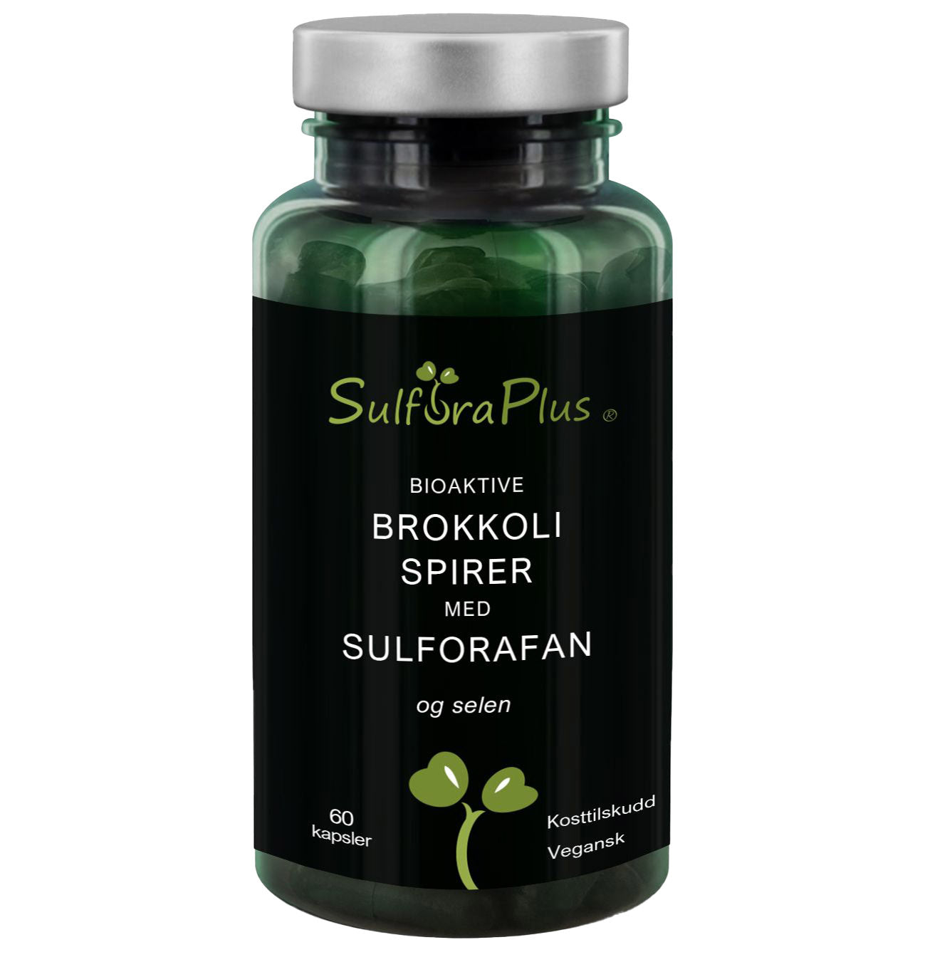 SulforaPlus er et naturlig og økologisk kosttilskudd med sulforafan fra hele brokkolispirer, ikke ekstrakter. Ett glass inneholder 60 kapsler.